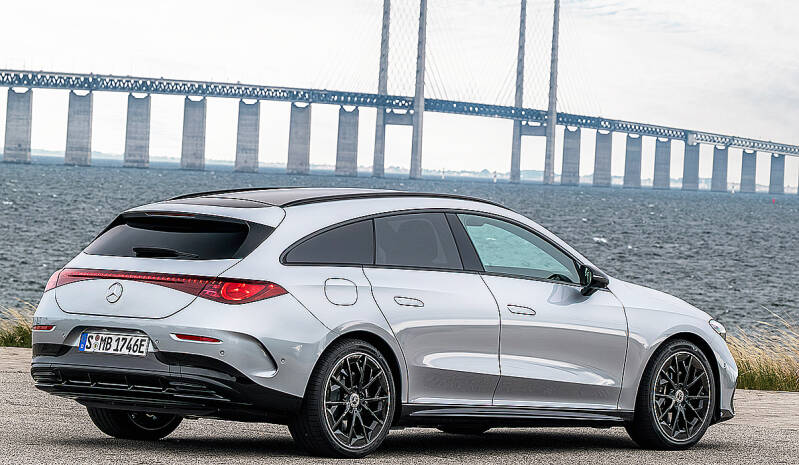 Mit dem neuen CLA Shooting Brake führt Mercedes‑Benz die sportlichen Proportionen des CLA mit mehr Laderaum und einer stilvollen Heckklappe in das elektrische Zeitalter. Von den Powerdomes auf der Motorhaube bis hin zum markanten Heck ist der neue vollelektrische CLA Shooting Brake auf Athletik ausgelegt. Das Dach ist weit nach hinten gezogen und endet elegant flach. Das serienmäßige Glasfestdach reicht fugenlos vom Frontscheibenrahmen bis zum Heck. Raffinierter Kniff: Der Dachspoiler ist am Übergang vom Glasdach schwarz und im äußeren Bereich in Wagenfarbe lackiert. Dies erweckt den Eindruck, als würde sich das Glasdach bis in die Heckscheibe fortsetzen und verleiht dem Heck eine einzigartige Eleganz.