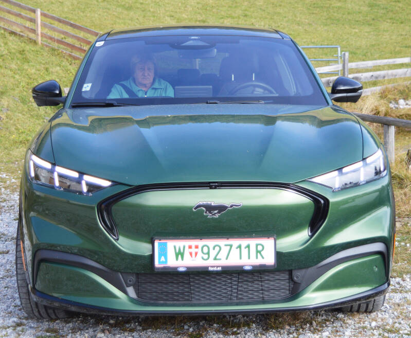 Der Ford Mustang war, ist und bleibt immer noch Traum. Heutzutage aber durchaus leistbar., der Mach-E wird derzeit in Aktion um Euro 43.390,- angeboten. Unser Nachbar konnte sich den V8-Mustang dazumal nicht leisten und fuhr wortwörtlich Granada - ein Ford-Modell, für all jene jüngeren Datums. Also konnte sich Miroslav an unserem Testfahrzeug auch nicht sattsehen und wollte unbedingt einmal selbst hinter dem Lenkrad Platz nehmen. Aber er kroch auch auf die Rückbank, sah sich im Innen- und Kofferraum um und konnte mit den Zahlen am Türholm wenig anfangen.